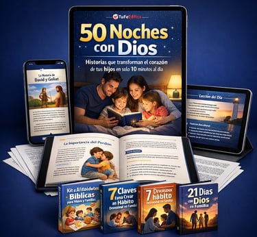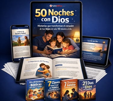 “50 Noches con Dios” es un material devocional creado para ayudar a padres cristianos a sembrar la fe en el corazón de sus hijos de una manera sencilla, práctica y profunda.